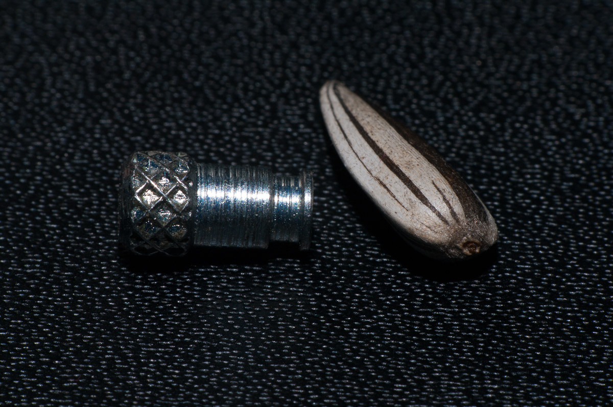 Arretierzapfen für Stahlzargen-Federband (L ca. 8 mm, ø ca. 5 mm) und Sonnenblumenkern.