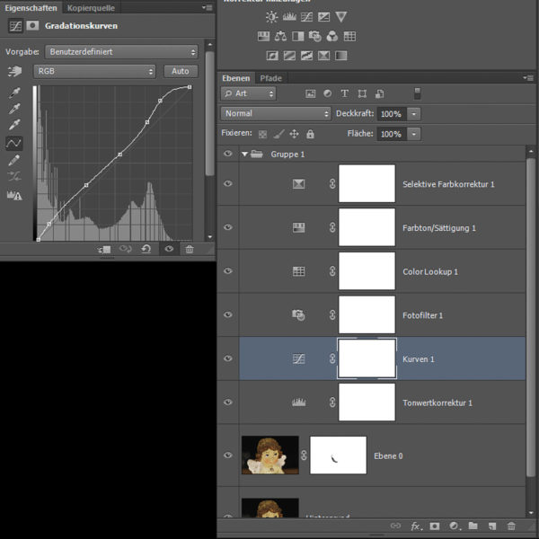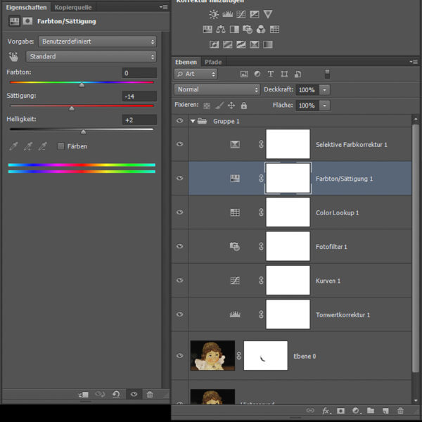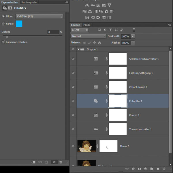 Ein neuer Ebenen-Ordner, den man bei Bedarf zum direkten Vergleich von „Original & Fälschung“ mit Inhalt insgesamt aktivieren bzw. deaktivieren kann, enthält die Gruppe der rudimentär erforderlichen Filter. Ich hab mir für diesen Arbeitsgang eine Aktion angelegt, um den Blödsinn nicht immer wieder zeitraubend reproduzieren zu müssen.