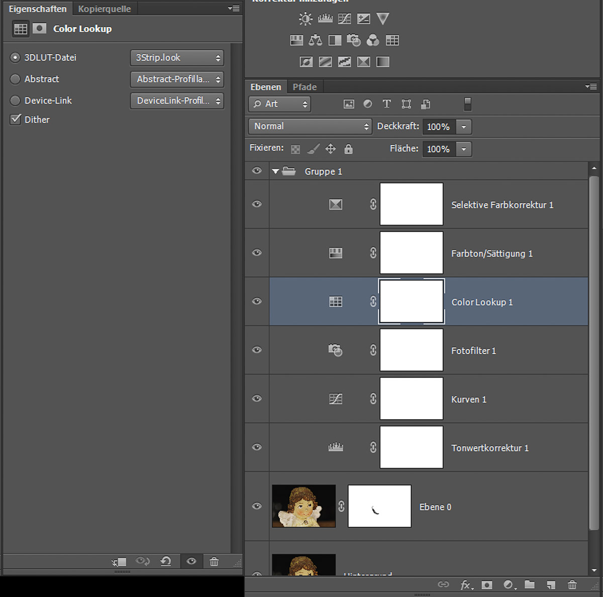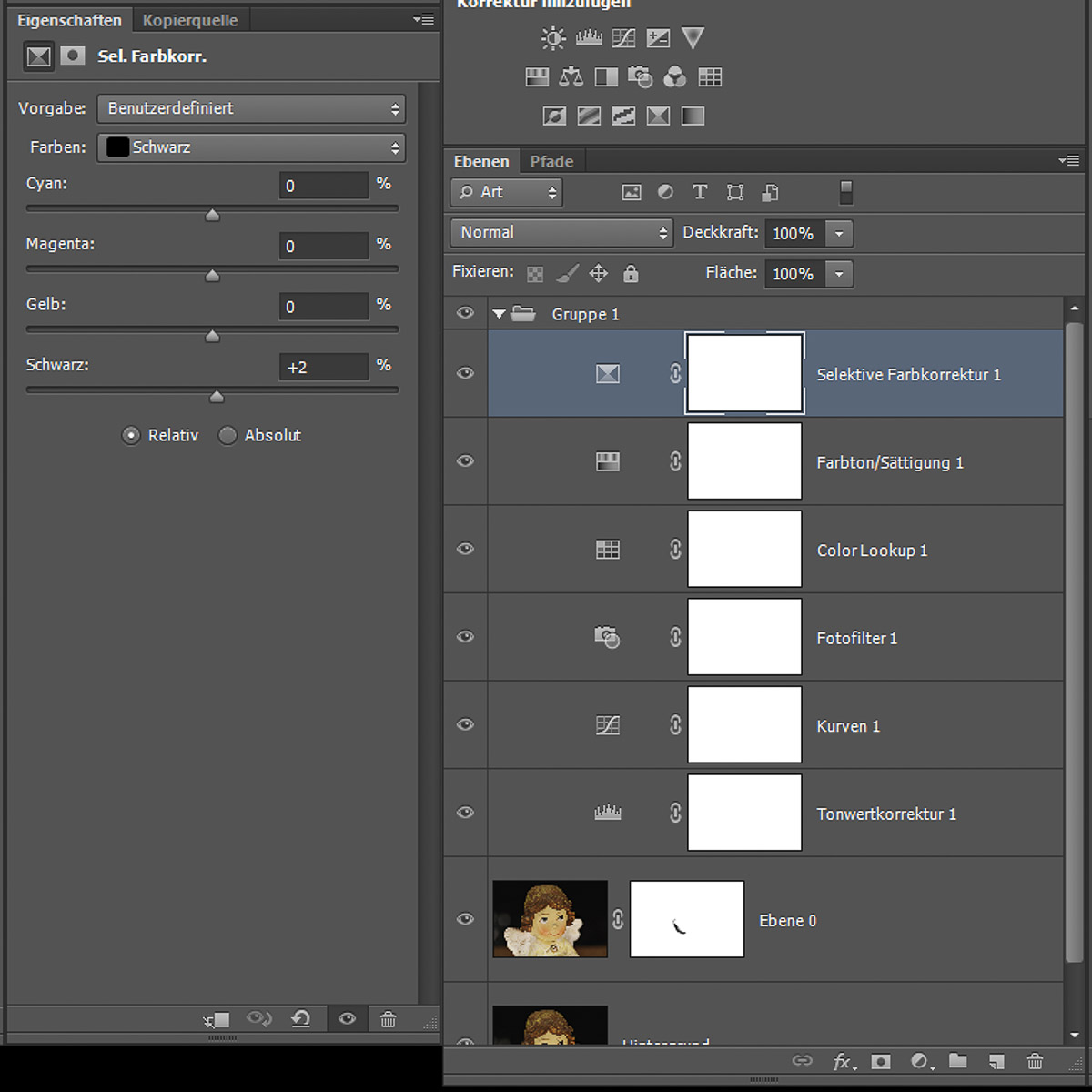 Ein neuer Ebenen-Ordner, den man bei Bedarf zum direkten Vergleich von „Original & Fälschung“ mit Inhalt insgesamt aktivieren bzw. deaktivieren kann, enthält die Gruppe der rudimentär erforderlichen Filter. Ich hab mir für diesen Arbeitsgang eine Aktion angelegt, um den Blödsinn nicht immer wieder zeitraubend reproduzieren zu müssen.