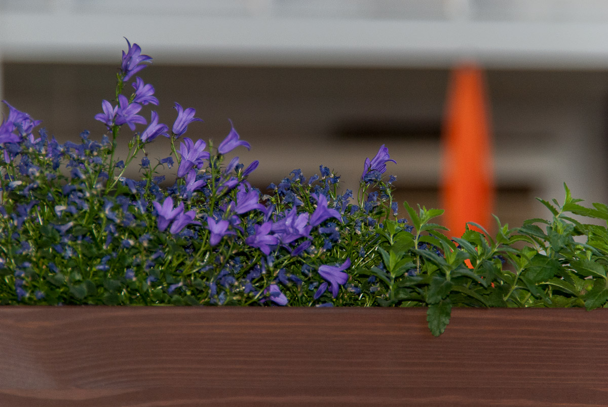 Farbtest mit eingebautem Aufhellblitz. Der Hintergrund bekommt immer noch natürliches Sonnenlicht. Der Vordergrund liegt im Schatten und musste aufgehellt werden. Die Farbe der Glockenblume und die Farbe des Sonnenschirms waren im von der Kamera erzeugten Bild keinesfalls natürlich. Der Blaustich konnte nicht mit den Weissabgleichsparametern der Kamera sondern nur durch Nachbearbeitung in PS entfernt werden.