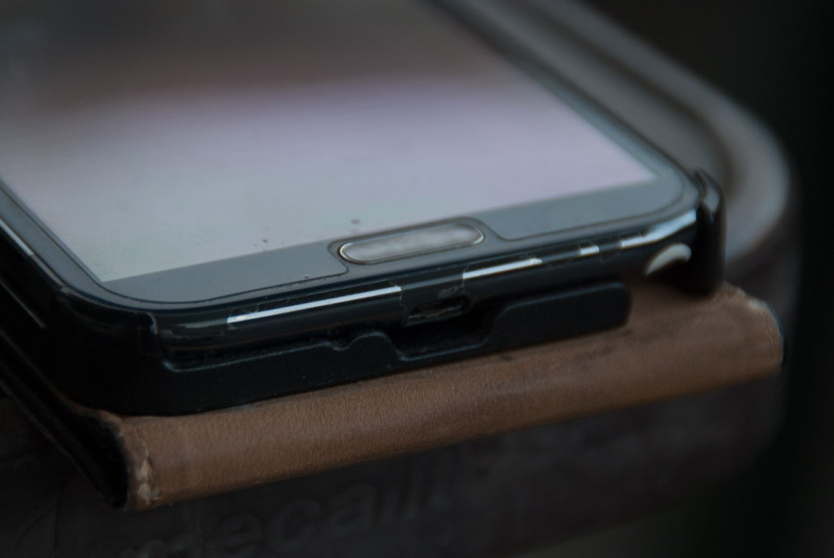 Der auffällige Blau-Lila-Stich macht sich bei schwachem Dämmerungslicht bemerkbar. Das am unteren Bildrand gezeigte Naturleder und der sich im Display des Smartphones spiegelnde Himmel sind deutlich vom natürlichen Originalfarbton entfernt.