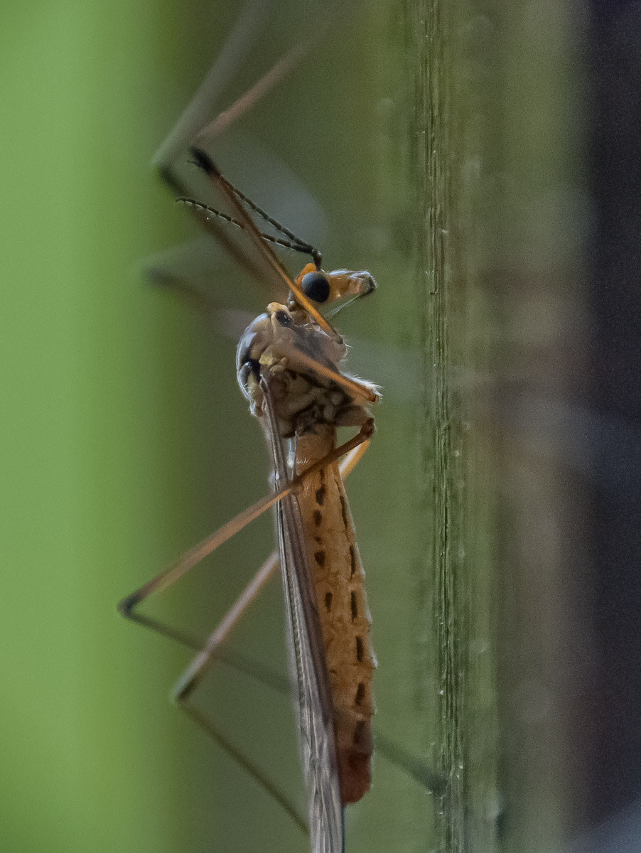 Makrotest mit RAYNOX 250 und eingebautem Blitz. Die Schnake sitzt an einem dunkel gestrichenen Holzblumenkübel. Der Hintergrund erzeugte Gegenlicht. Nur ein Aufhellblitz konnte die Schnake sichtbar machen. Mit dem eingebauten Blitz der D60 lässt sich das also realisieren.