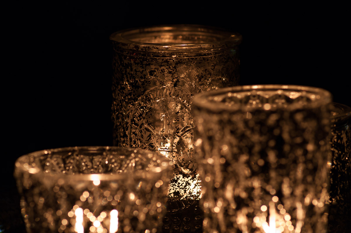 Ohne Blitz. Nur mit dem verfügbaren Kerzenlicht. Um die Schärfeebene etwas auszuweiten Blende 4. Der hohe ISO Wert führt zum Bildrauschen. Und 1/20 sec. lässt das Rauschen schon wieder verschwimmen …