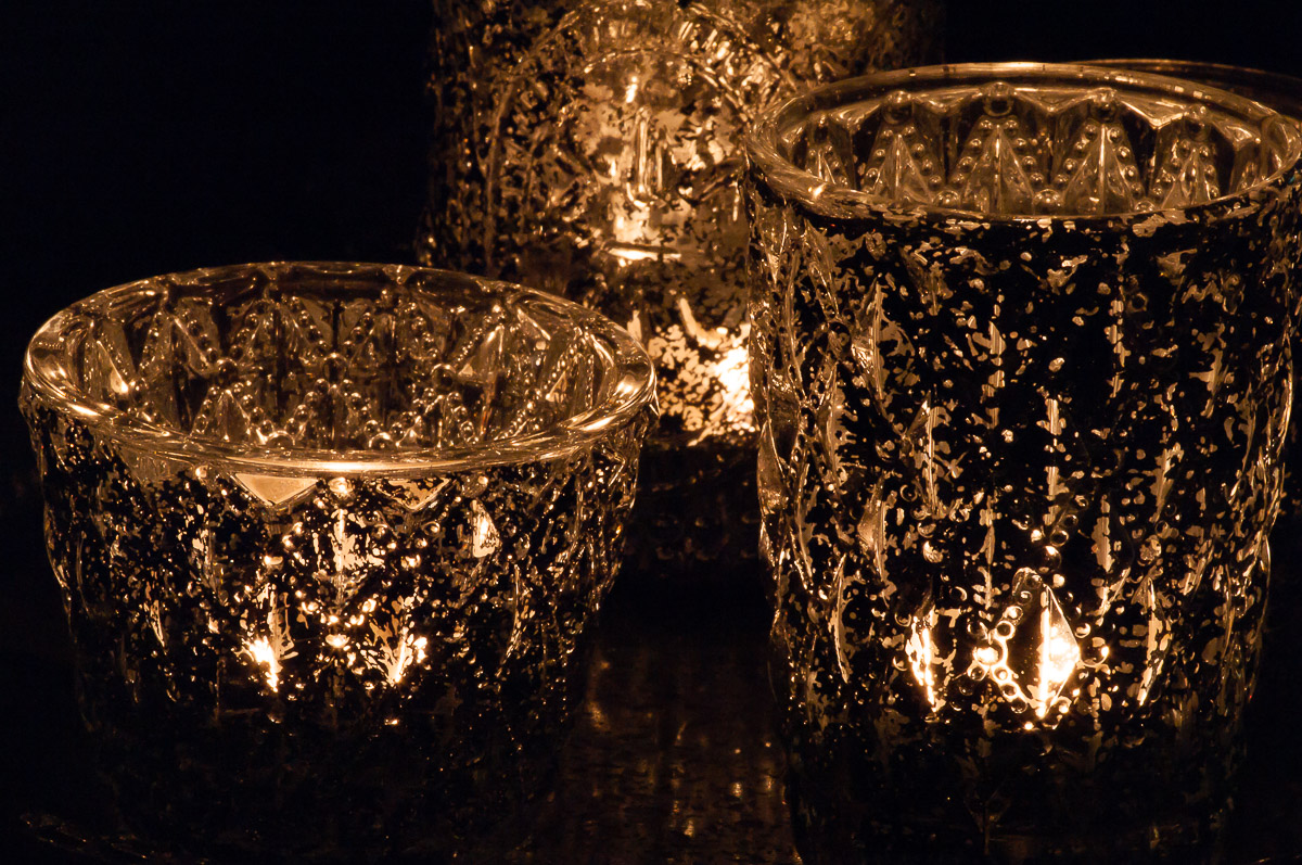 Ohne Blitz. Nur mit dem verfügbaren Kerzenlicht. Um die Schärfeebene stark auszuweiten Blende 22. Der hohe ISO Wert führt zum deutlichen Bildrauschen. Die Belichtungszeit von 0,3 sec. hab ich mit dem Knie als Stativ realisiert.
